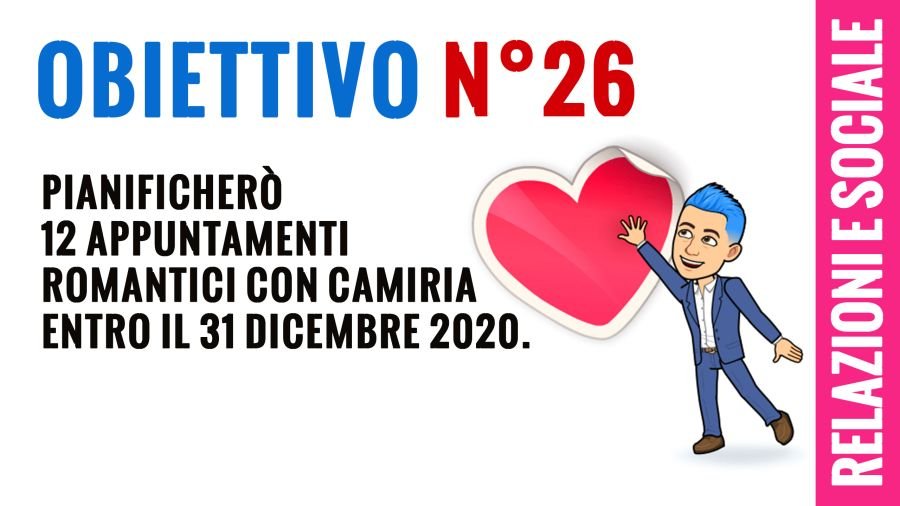 26) Pianificherò 12 appuntamenti romantici con Camiria almeno 1 volta al mese entro il 31 Dicembre 2020.