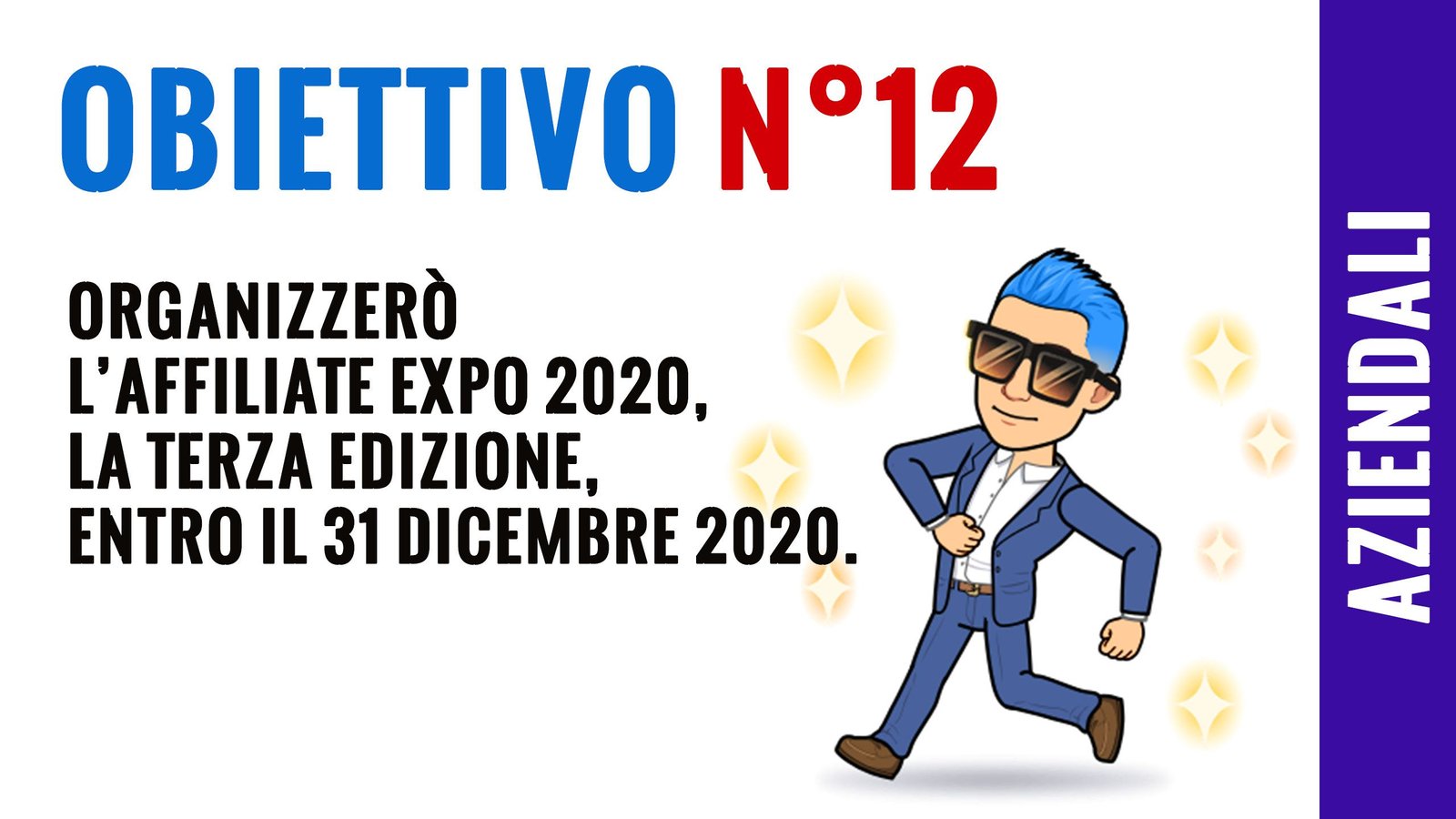 12) Organizzerò l’Affiliate Expo 2020, la terza edizione, per aiutare sempre più persone a entrare nel mondo dell’Affiliate Marketing, creare networking e sinergie, far crescere il mercato italiano dell’Affiliate Marketing entro il 31 Dicembre 2020.