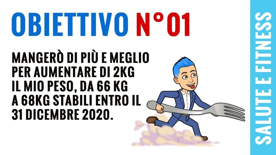 1) Mangerò di più e di migliore qualità per aumentare di 2kg il mio peso, passando da 66 kg a 68kg stabili entro il 31 Dicembre 2020. (Nel 2017 sono passato da 58 a 60, nel 2018 da 60 a 62 e nel 2019 da 62 a 66kg.