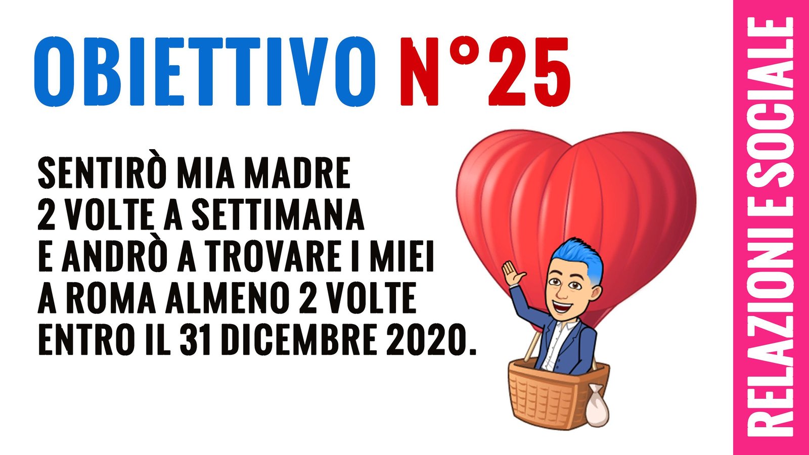 25) Sentirò mia madre almeno 2 volte a settimana e andrò a trovare i miei a Roma almeno 2 volte entro il 31 Dicembre 2020.