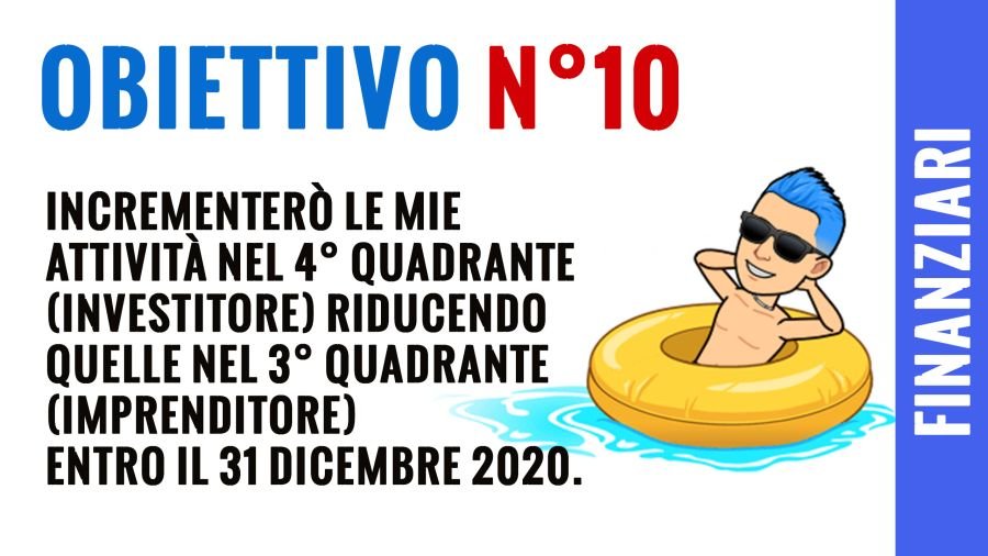 10) Incrementerò le mie attività nel 4° quadrante (Investitore) riducendo quelle nel 3° quadrante (imprenditore) entro il 31 Dicembre 2020.