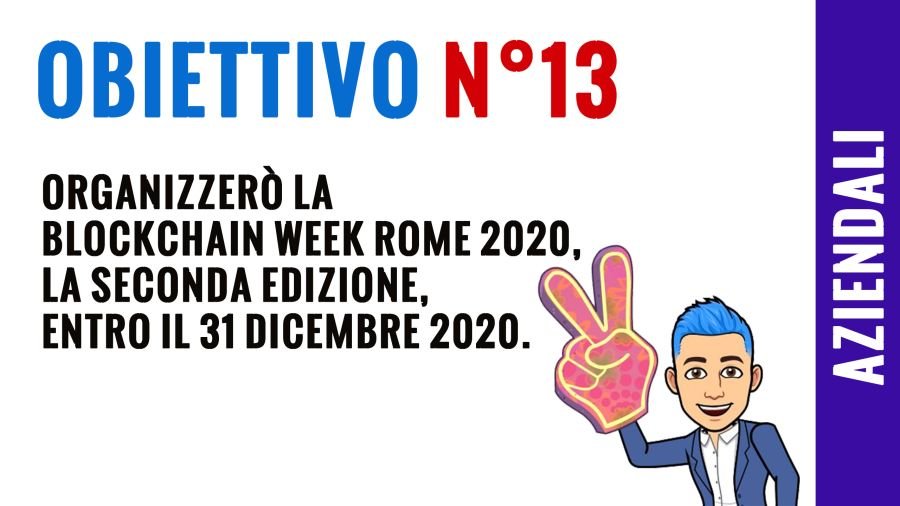 13) Organizzerò la Blockchain Week Rome 2020, la seconda edizione, per permettere a sempre più persone di scoprire il magico mondo della Blockchain e delle Criptovalute entro il 31 Dicembre 2020.