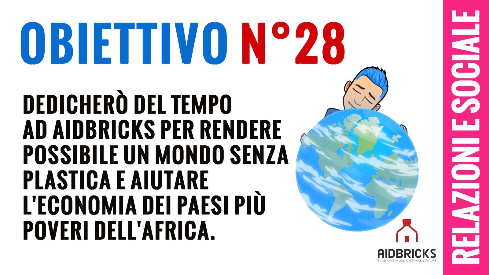 28) Dedicherò del tempo ad Aidbricks, di cui sono uno dei soci fondatori, per rendere possibile un Mondo senza plastica e aiutare l’economia dei paesi più poveri dell’Africa.