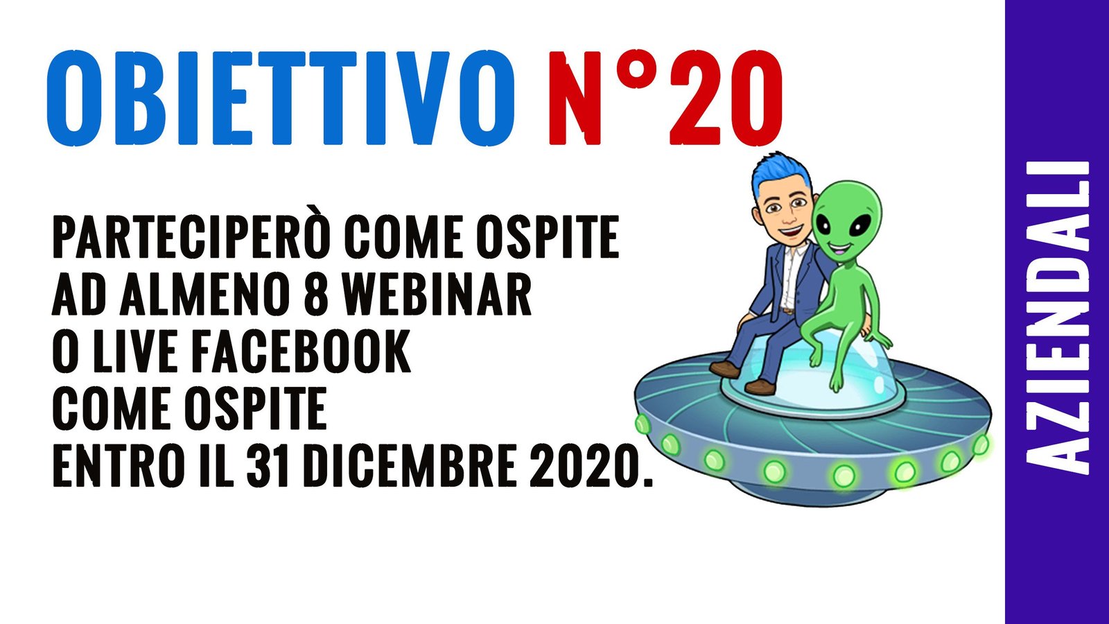 20) Parteciperò come ospite ad almeno 8 webinar o live facebook come ospite entro il 31 Dicembre 2020.