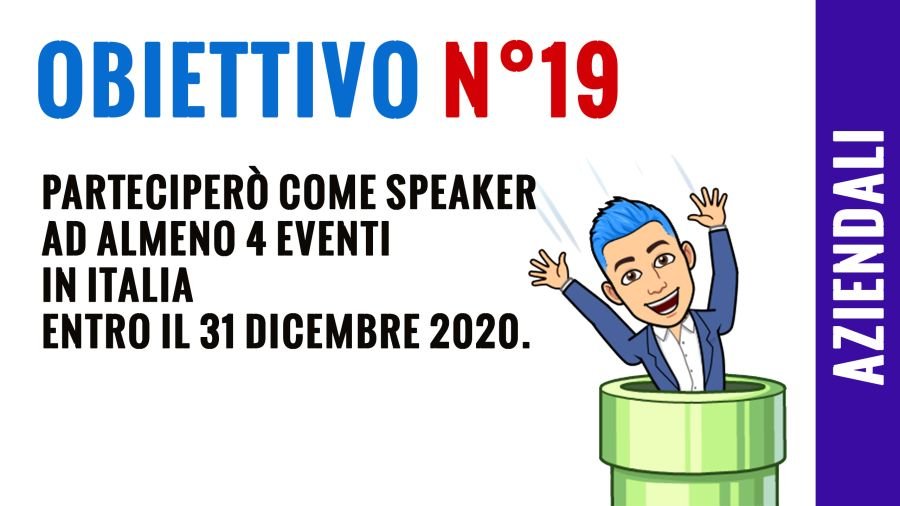 19) Parteciperò come speaker ad almeno 4 eventi in Italia entro il 31 Dicembre 2020.