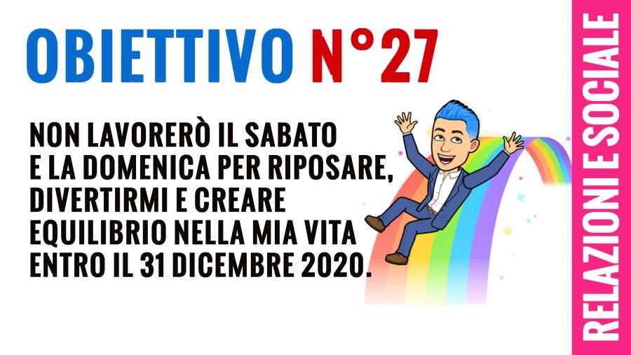 27) Non lavorerò il sabato e la domenica (salvo durante gli eventi) per riposare, divertirmi e creare equilibrio nella mia vita entro il 31 Dicembre 2020.