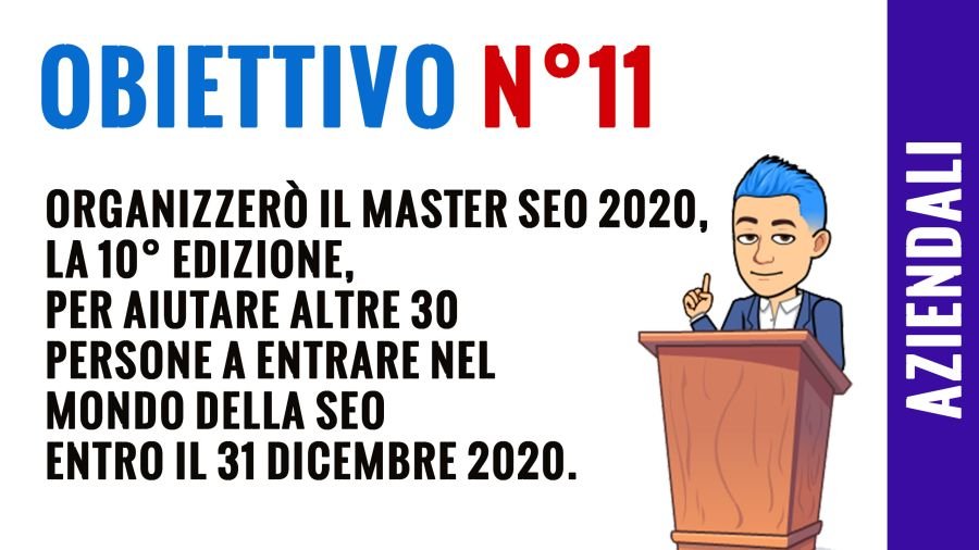 11) Organizzerò il Master SEO 2020, la 10° edizione, per aiutare altre 30 persone a entrare nel mondo della SEO trasmettendo la mia esperienza di quasi 20 anni nel Search Marketing entro il 31 Dicembre 2020.